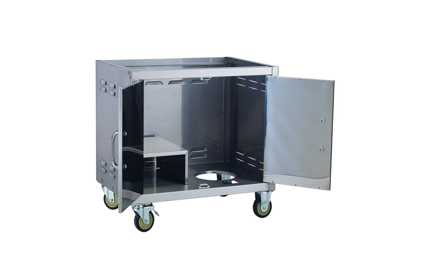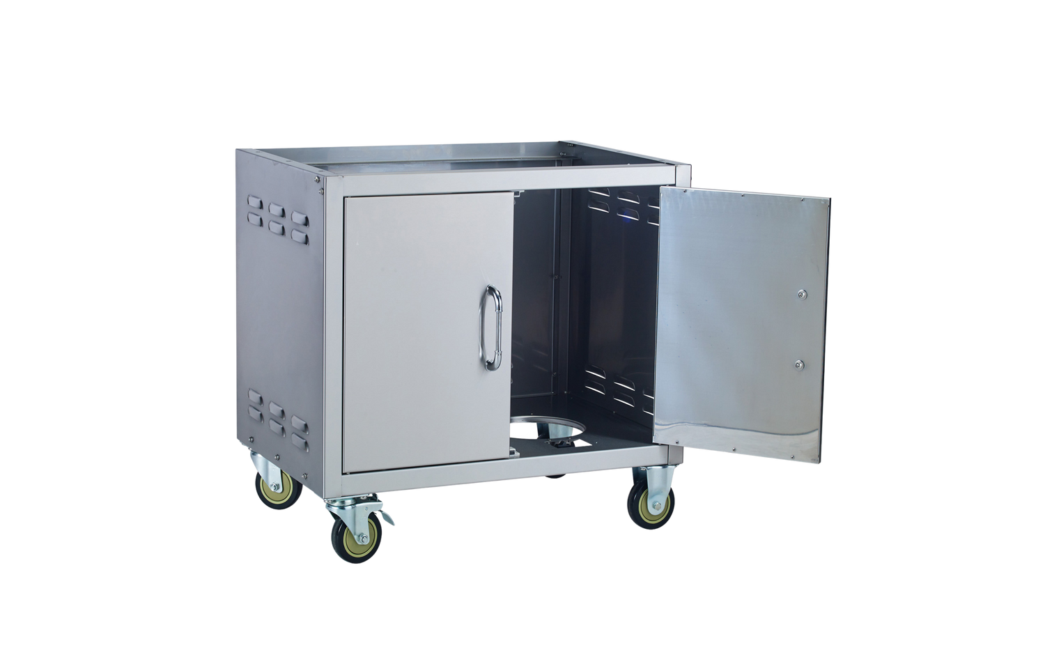 • Storage: Features a fully enclosed cabinet with a propane tank holder and a stainless steel shelf offering two storage options.